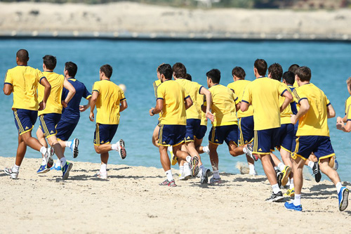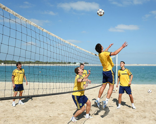 На втором этапе команда переместилась на пляж около отеля. Здесь футболисты совершили пробежку с Мишелем Хуффом, а затем поиграли мячом через сетку. Вратари в это время уже привычно «пахали» песок под руководством Андрея Кудымова - вот уж точно, кто своих подопечных любит, уважает, но трудиться заставляет на 110%..jpg)